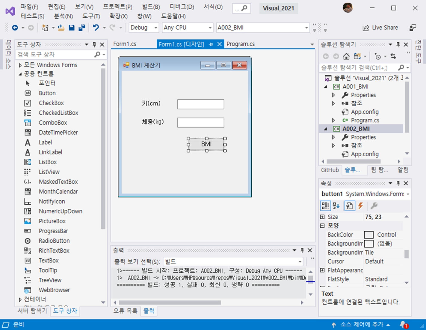 1) 공용 컨트롤: Lable(키(cm) 등), TextBox(입력칸), Button