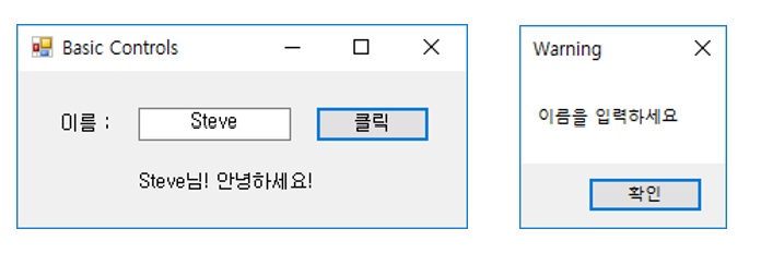 | private void btnClick_Click(object sender, EventArgs e) { if (txtName.Text != "") lblResult.Text = txtName.Text + "님! 안녕하세요!"; else MessageBox.Show("이름을 입력하세요", "Warning"); } |