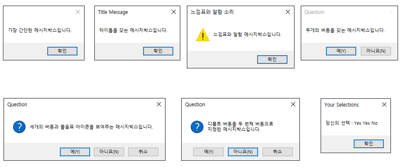 | private void Form1_Load(object sender, EventArgs e) { MessageBox.Show("가장 간단한 메시지박스"); MessageBox.Show("타이틀을 갖는 메시지박스", "타이틀"); MessageBox.Show("두개의 버튼을 갖는 메시지박스", "타이틀", MessageBoxButtons.YesNo); DialogResult result1 = MessageBox.Show("세개 버튼과 물음표 아이콘을 보여주는 메시지박스", "타이틀", MessageBoxButtons.YesNoCancel, MessageBoxIcon.Question); DialogResult result2 = MessageBox.Show("디폴트 버튼을 두번째 버튼으로\n 지정한 메시지박스", "타이틀", MessageBoxButtons.YesNoCancel, MessageBoxIcon.Question, MessageBoxDefaultButton.Button2); DialogResult result3 = MessageBox.Show("느낌표와 알람 메시지박스", "타이틀", MessageBoxButtons.OK, MessageBoxIcon.Exclamation); string msg = string.Format("당신의 선택: {0} {1} {2}", result1.ToString(), result2.ToString(), result3.ToString()); MessageBox.Show(msg); } } |
